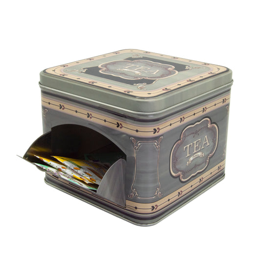 Recipiente cuadrado de lata con tapa y apertura ″TEA″