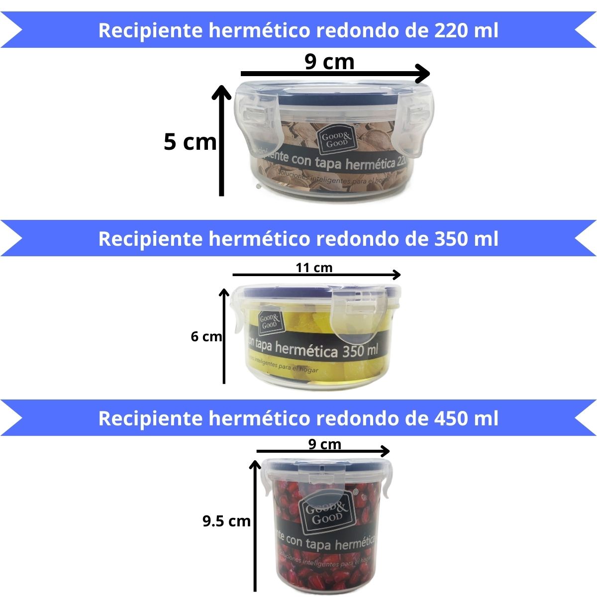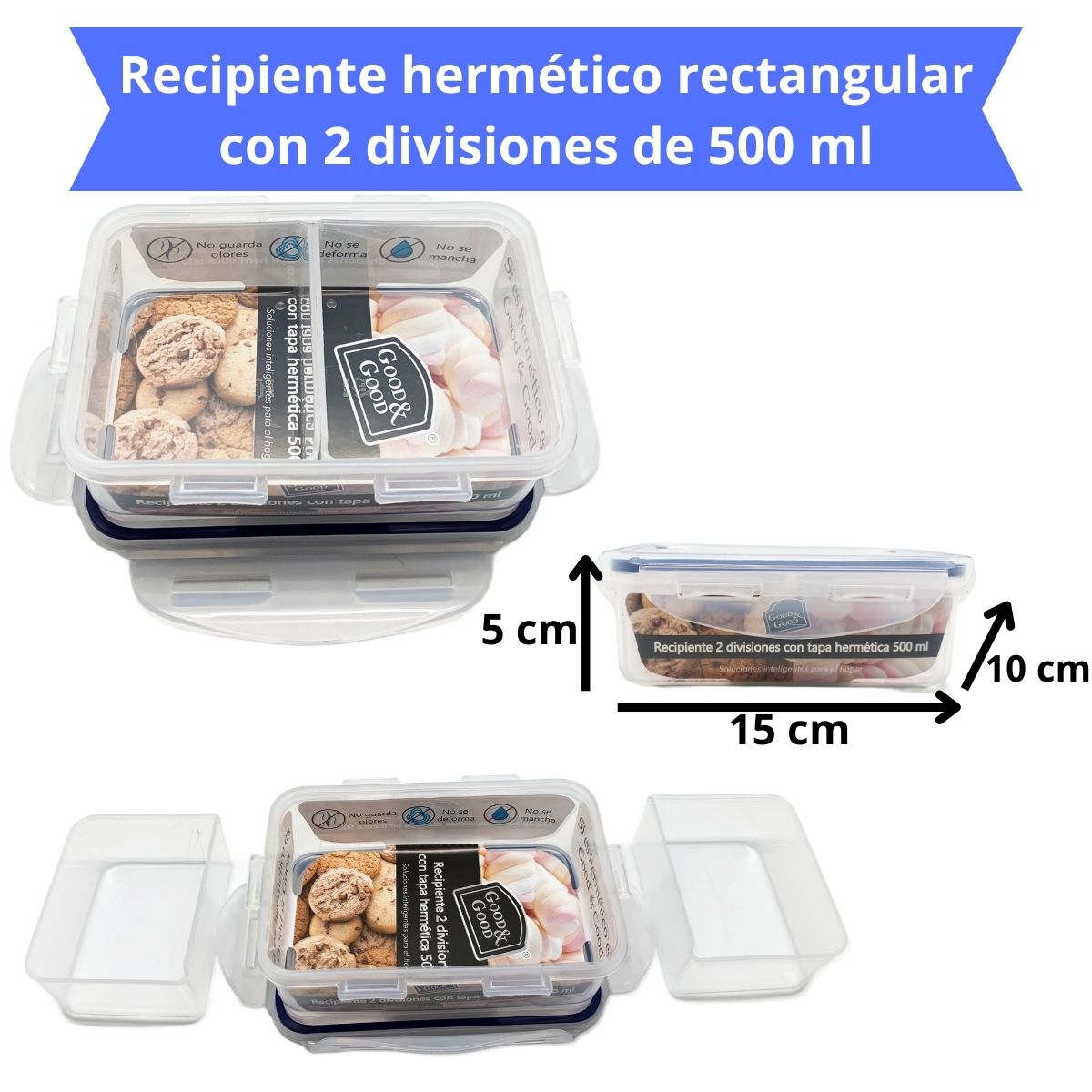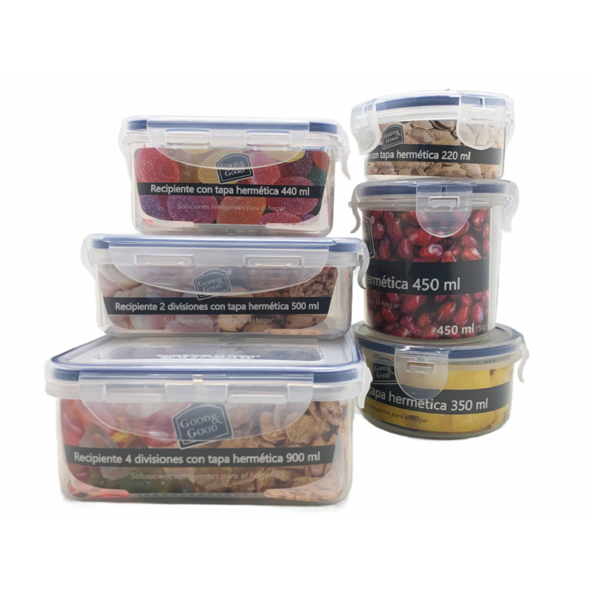 Estos contenedores transparentes te permiten ver fácilmente el contenido sin necesidad de abrirlos, mientras que sus tapas azules con cierre hermético aseguran que los alimentos se mantengan frescos y sin derrames. La marca 'Good & Good' se destaca por ofrecer 'Soluciones inteligentes para el hogar', brindándote productos prácticos y funcionales para organizar tu cocina.