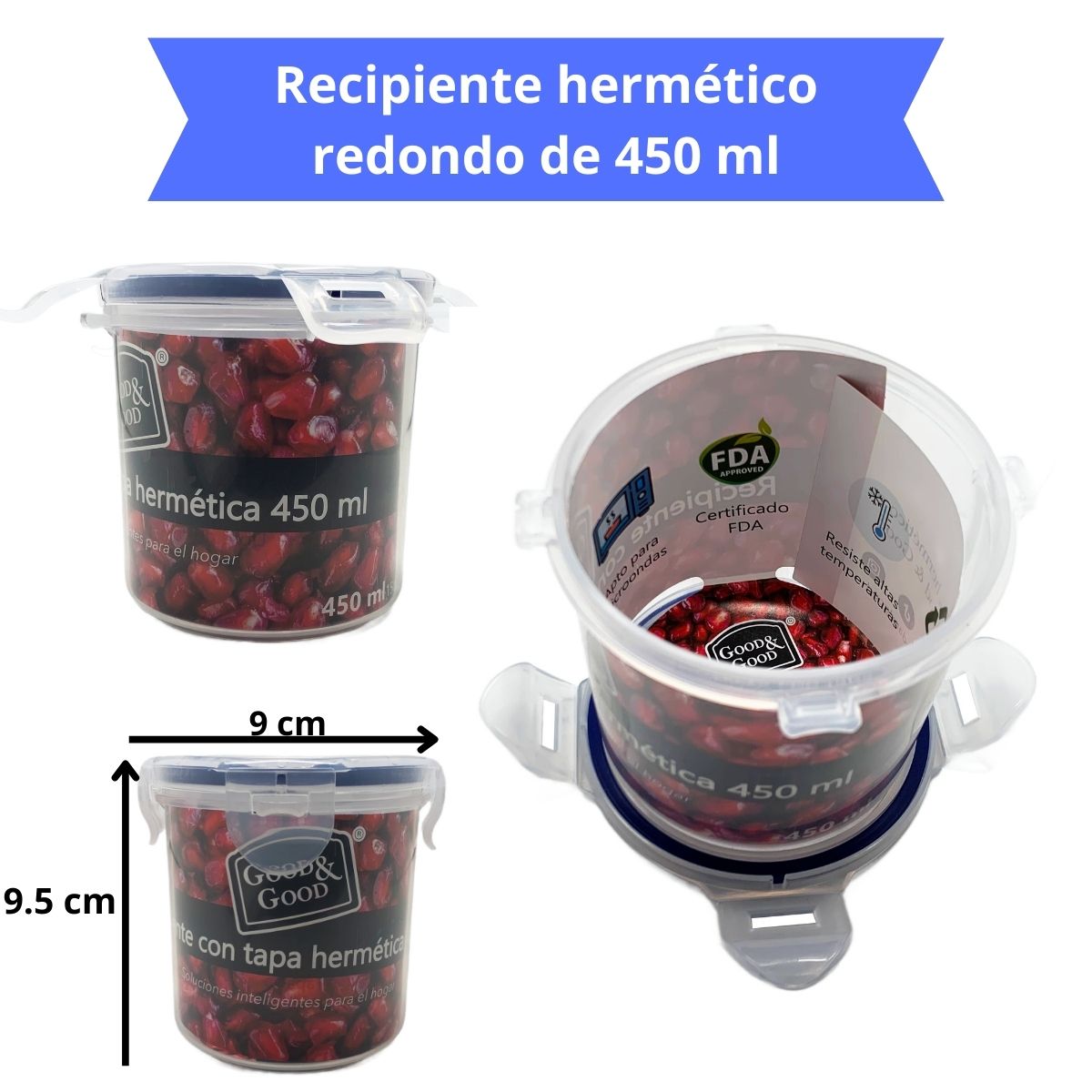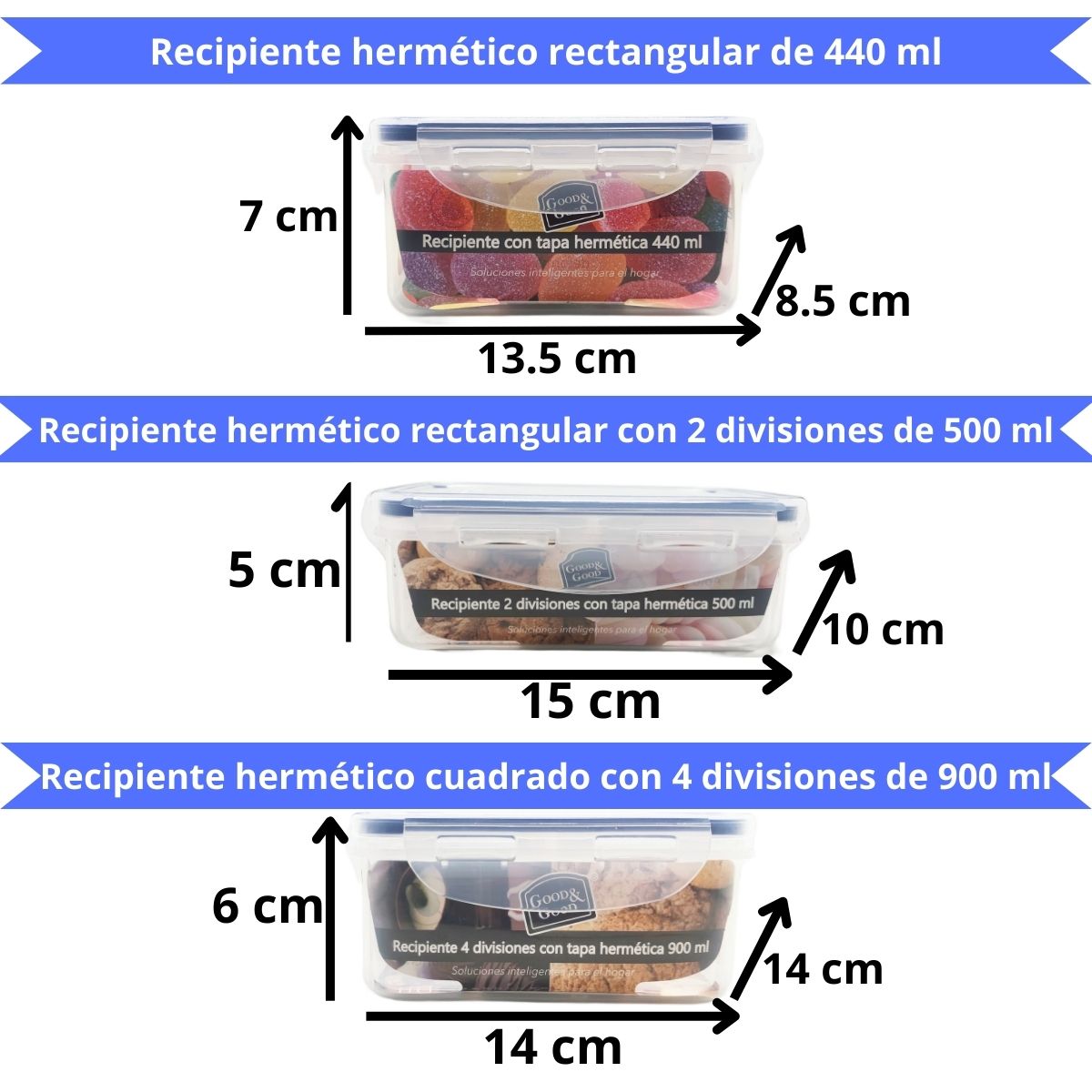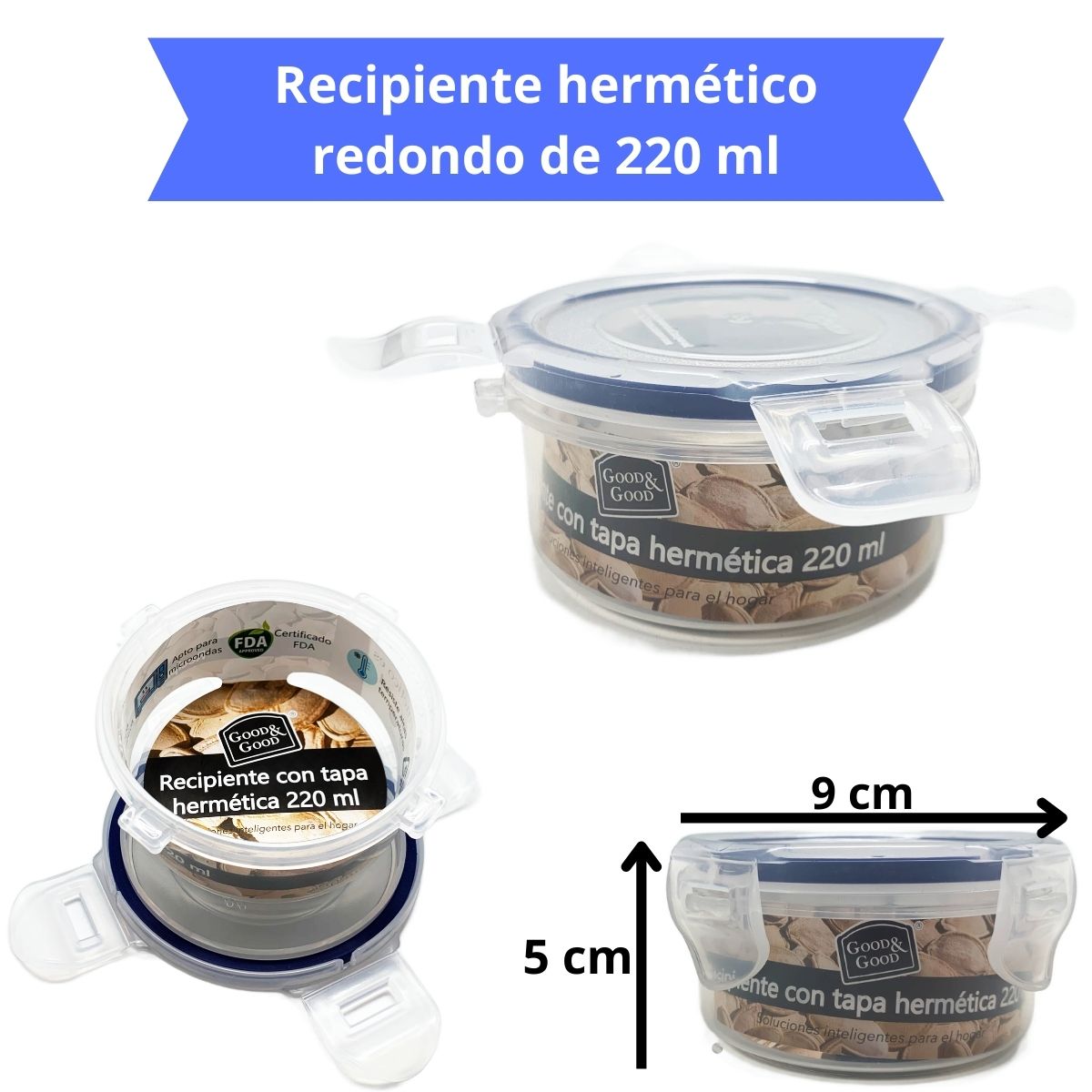 Estos contenedores transparentes te permiten ver fácilmente el contenido sin necesidad de abrirlos, mientras que sus tapas azules con cierre hermético aseguran que los alimentos se mantengan frescos y sin derrames. La marca 'Good & Good' se destaca por ofrecer 'Soluciones inteligentes para el hogar', brindándote productos prácticos y funcionales para organizar tu cocina.