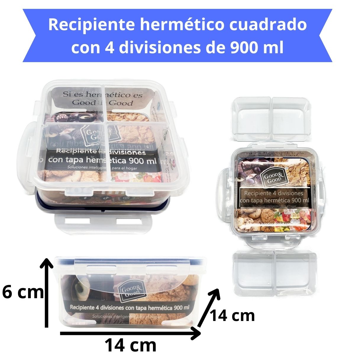 Recipiente con 4 divisiones con tapa hermética 900 ml: Excelente para organizar una variedad de bocadillos secos en un solo lugar, ideal para picnics o almuerzos escolares.
