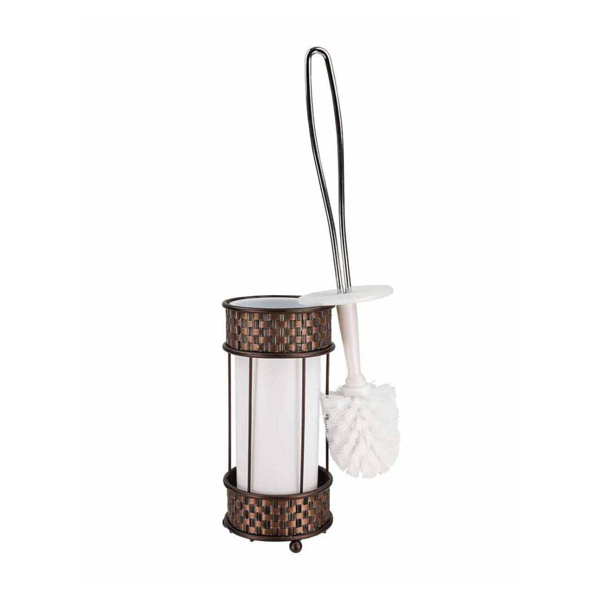 Anular El soporte decorativo con detalles en tejido de bronce oculta hábilmente la cabeza del cepillo del inodoro para un almacenamiento discreto y elegante Forma elegante para adaptarse a baños pequeños con patas redondeadas para mantener los pisos secos y libres de gérmenes El inserto de plástico del soporte es removible para limpiar la brisa