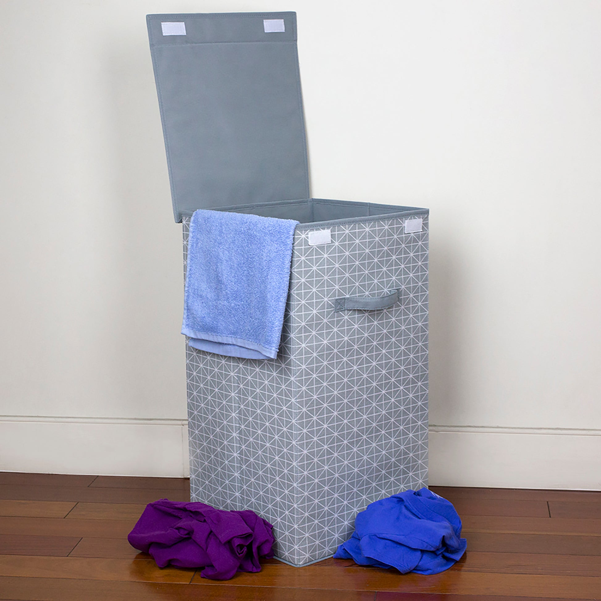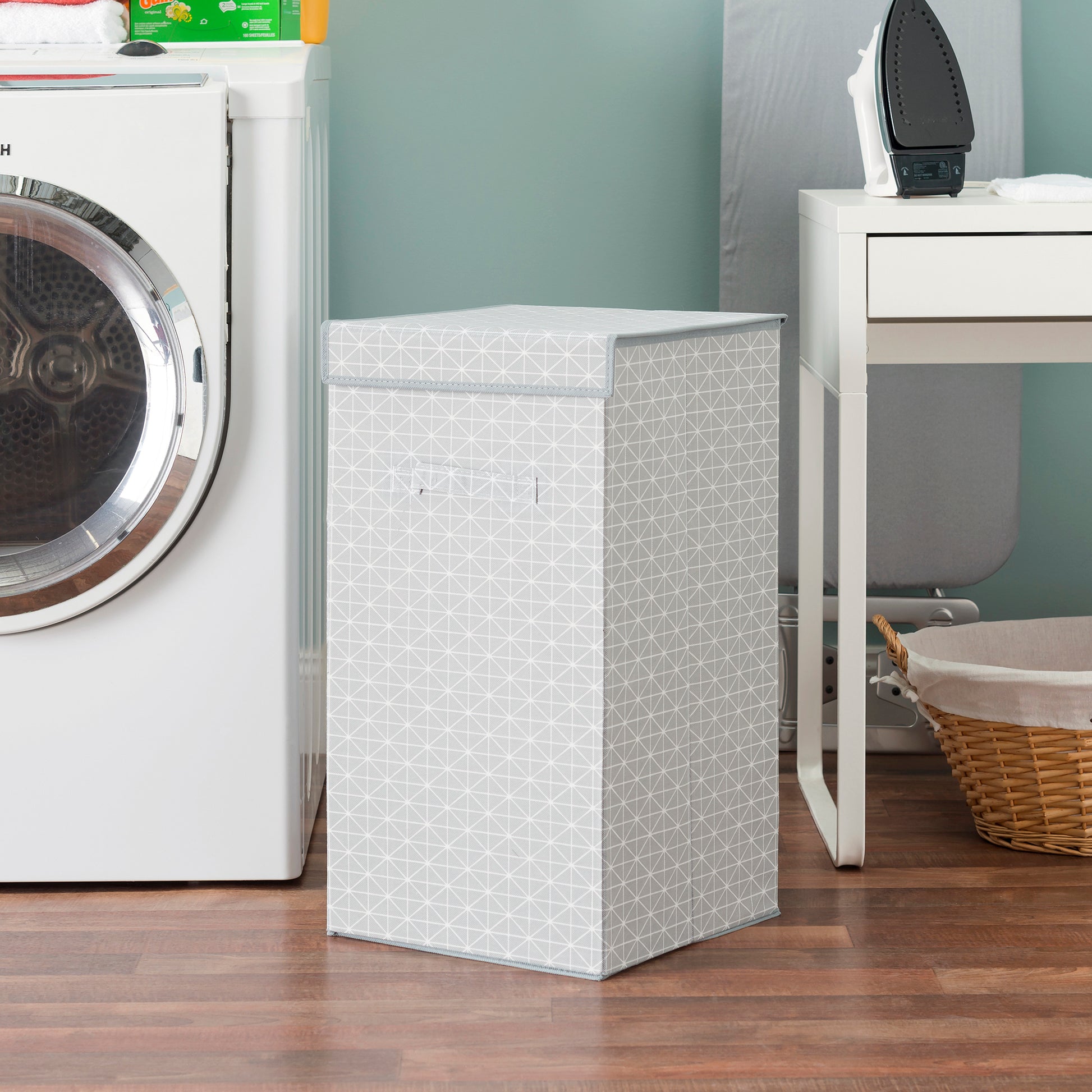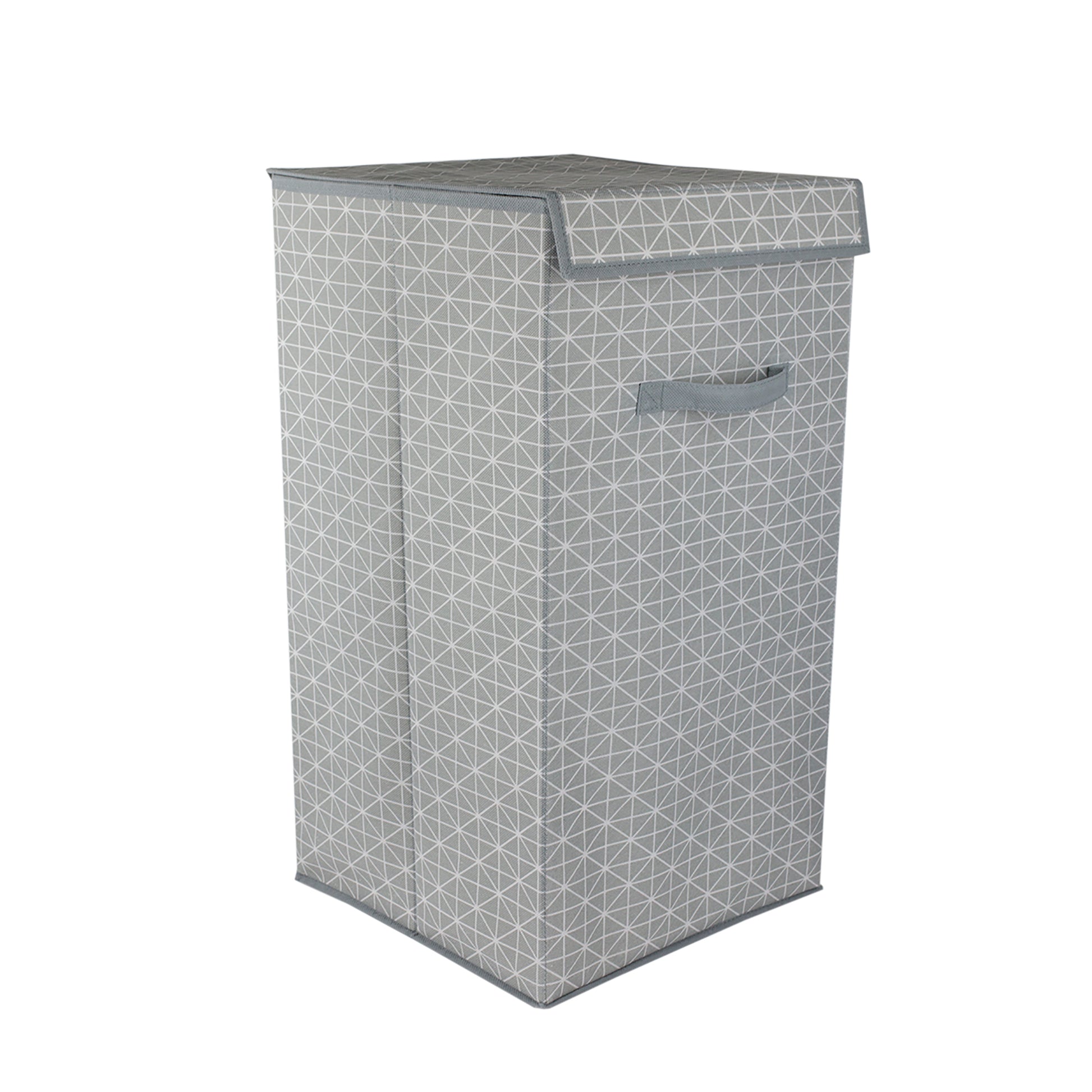 Estampado de diamantes con un tejido transpirable lo convierte en un complemento hermoso y práctico para cualquier hogar. Manténgalo en el baño, la lavanderÃa o el dormitorio para guardar una carga completa de la ropa. Completo con una manija delantera resistente, transfiérala fácilmente de la habitación. Una tapa cerrada segura mantiene el contenido oculto. Almacena convenientemente hasta dos cargas de ropa Diseño plegable para un almacenamiento fácil y compacto Hecho de material no tejido transpirable con un elegante estampado de diamantes Medidas de 14.25 pulg. X 14.25 pulg. X 24.75 pulg. Limpieza de manchas para un fácil mantenimiento.Â