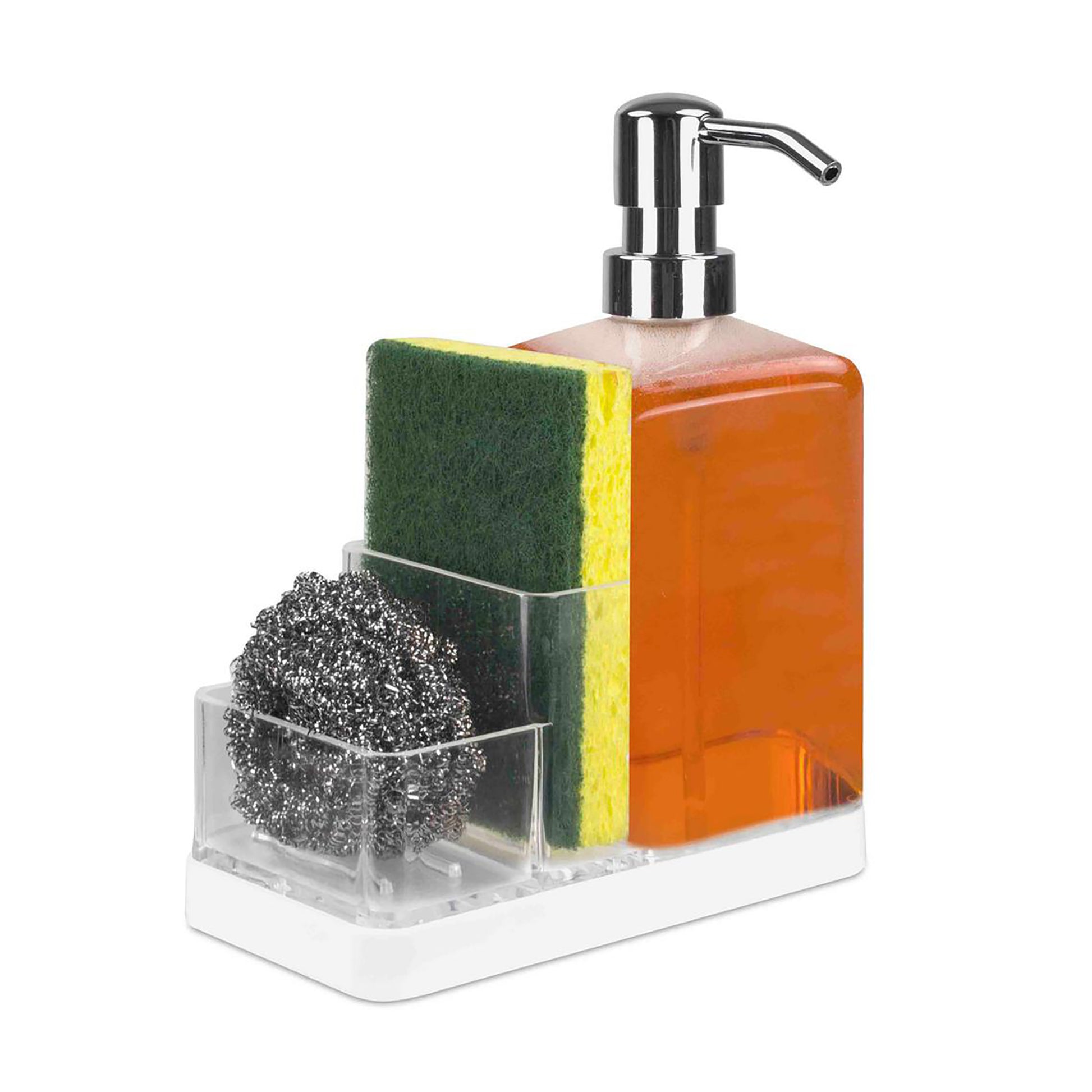 Dispensador para jabón lÃquido con 2 ranuras para sostener esponjas y otros productos de limpieza. Ocupa una pequeña cantidad de espacio para mayor comodidad. Color transparente para coordinar con la decoración existente. Perfecto para exhibir en el baño o la cocina. Dimensiones: 21 x 8 x 21 cm. Material: Plástico.