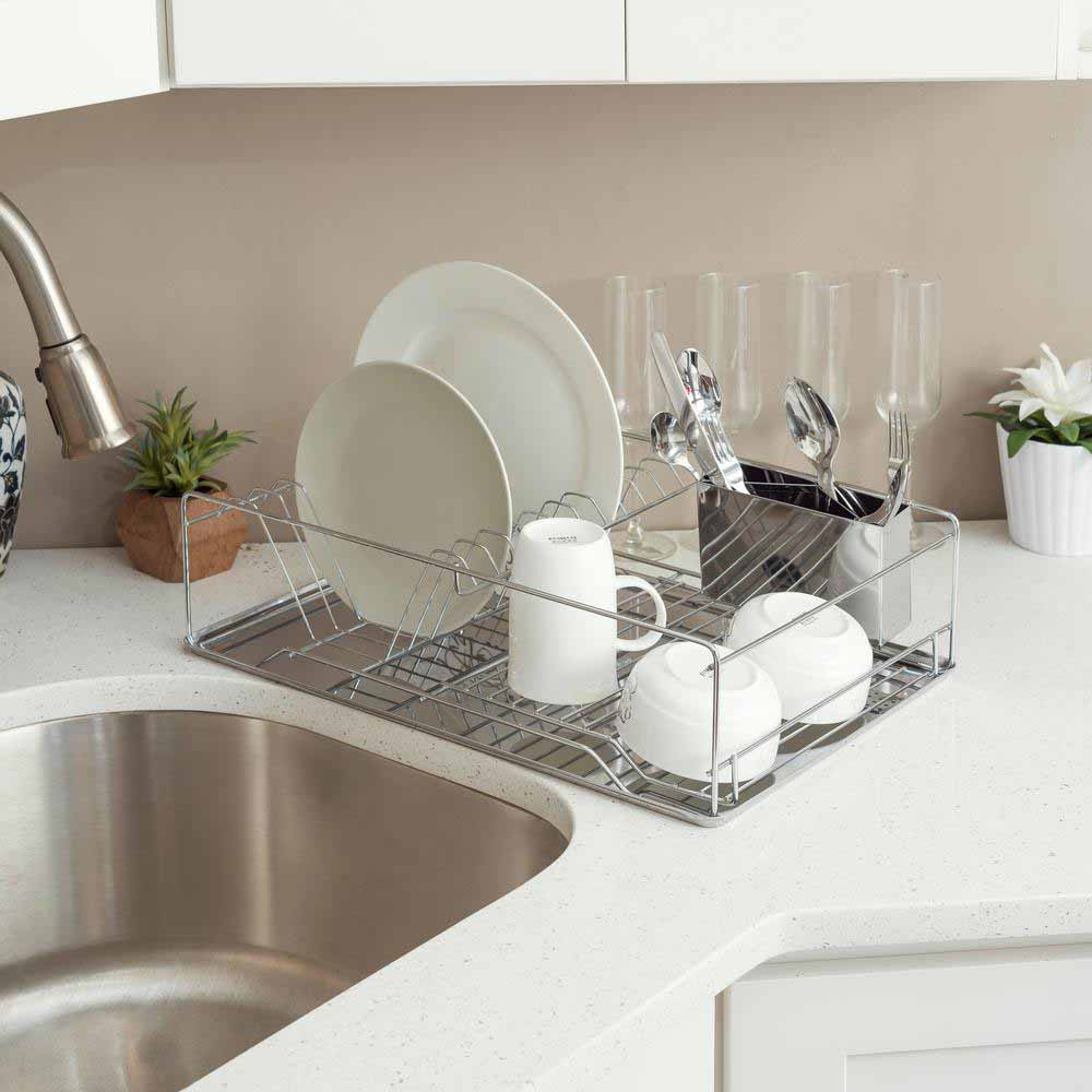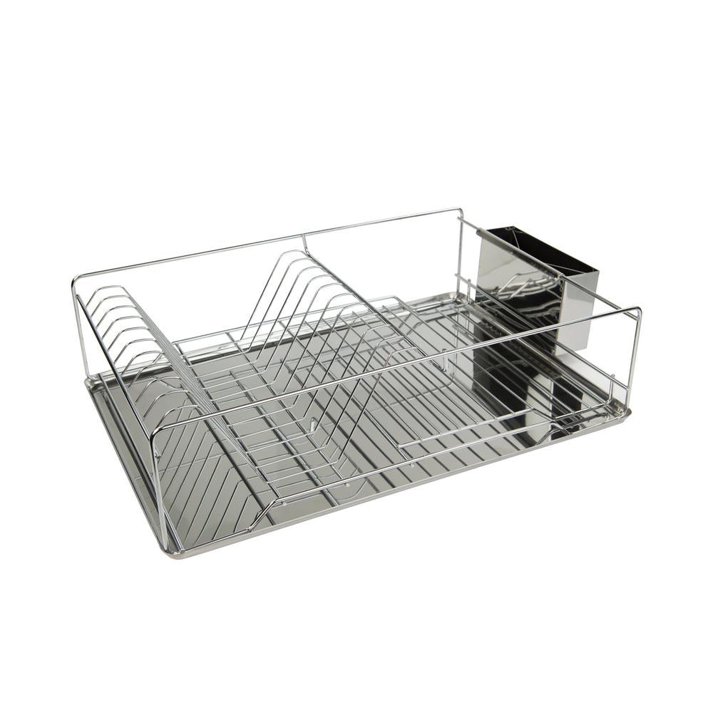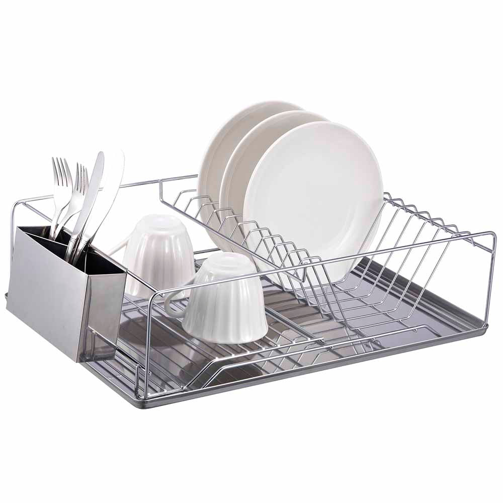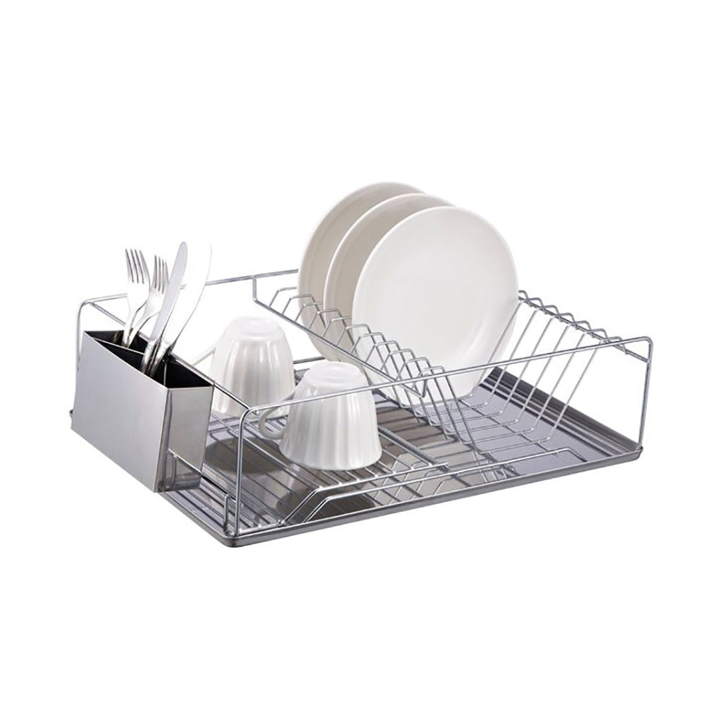 Escurridor de trastes de 1 nivele con bandeja. La mitad cuenta con rejillas para secar vasos o cualquier tipo de recipiente, y la otra mitad tiene rejillas para secar platos, en el lateria tiene un porta utensilios con 3 divisiones con orificios para un mejor secado. Este práctico escurridor permite acomodar más utensilios en menos espacio. Ayuda a mantener todo separado y acelera eficazmente el tiempo de secado. El diseño elegante es perfecto para cualquier cocina.