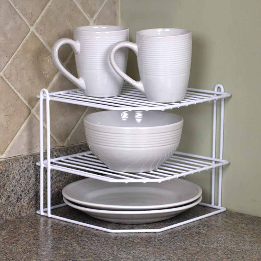 Hecho de acero con revestimiento de vinilo de alta calidad. Estante de esquina de 2 niveles, perfecto para armarios de cocina o encimera en cualquier esquina no utilizada. Mantiene las especias y tazas ordenadas y organizadas. Dimensiones: 23 x 23 x 22 cm.