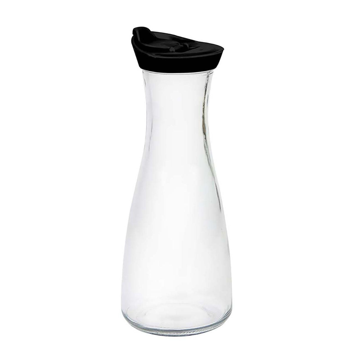 Jarra de vidrio con tapa color negra de plástico con boquilla hermética para servir los lÃquidos. El diseño de la forma ancha abajo y delgada conforme va subiendo facilita tomarla para servir mejor.