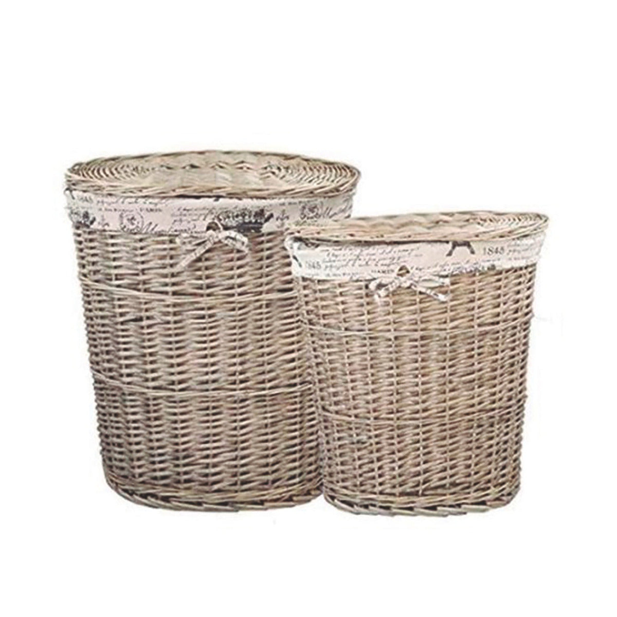 Set de 2 cestos de mimbre con funda interna de tela. El cesto grande mide 50cm de alta por 35cm de ancho y el pequeño 48 x 42 cm. Son ideales para colocar tu ropa sucia. Diseño elegante.