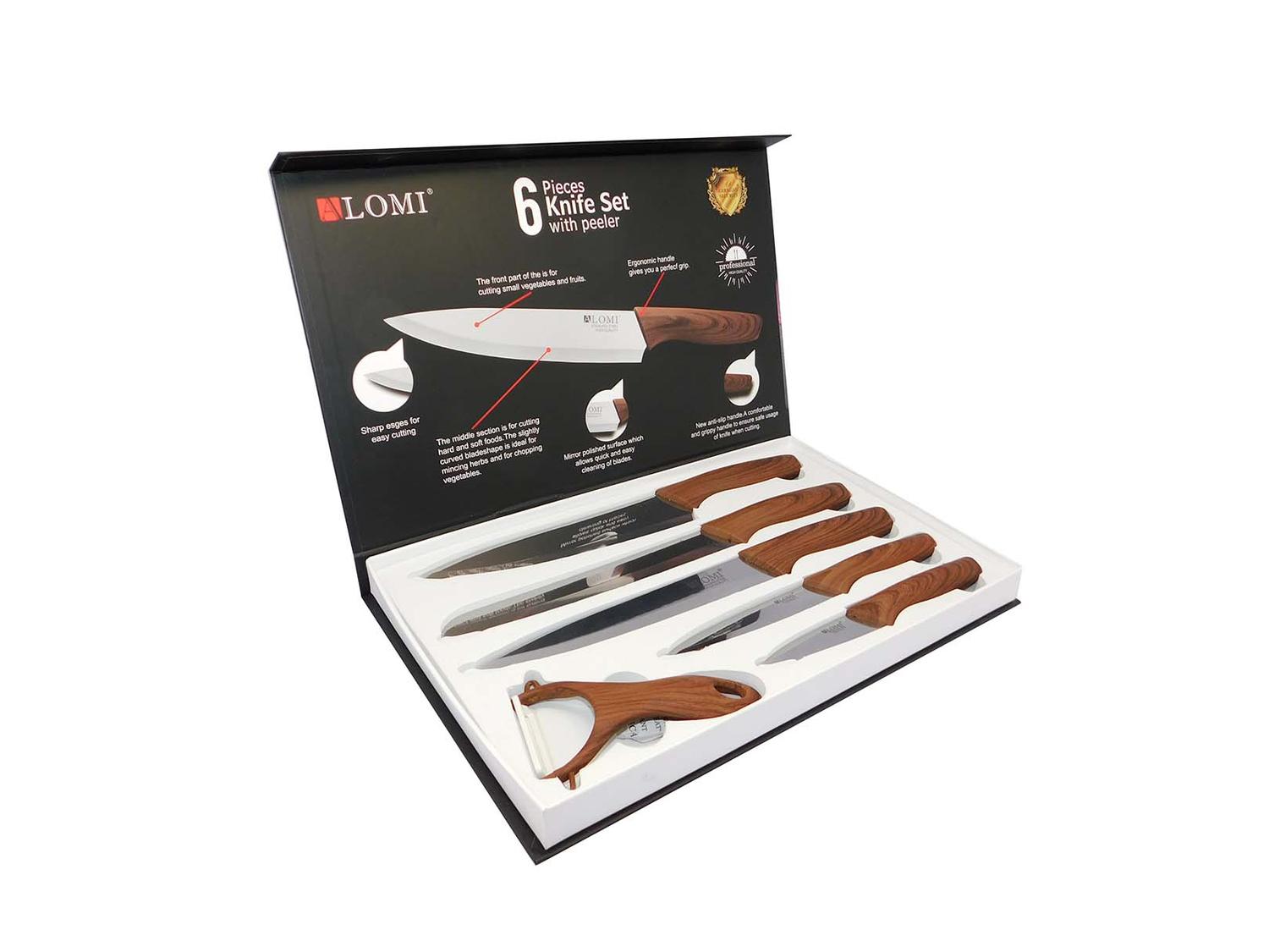 Juego de 5 cuchillos de diferentes tamaños hechos de acero inoxidable con mango de plástico tipo madera antideslizante. Incluye 1 pelador. Diseño con superficie pulida tipo espejo que permite limpiar rápidamente y fácilmente las navajas.