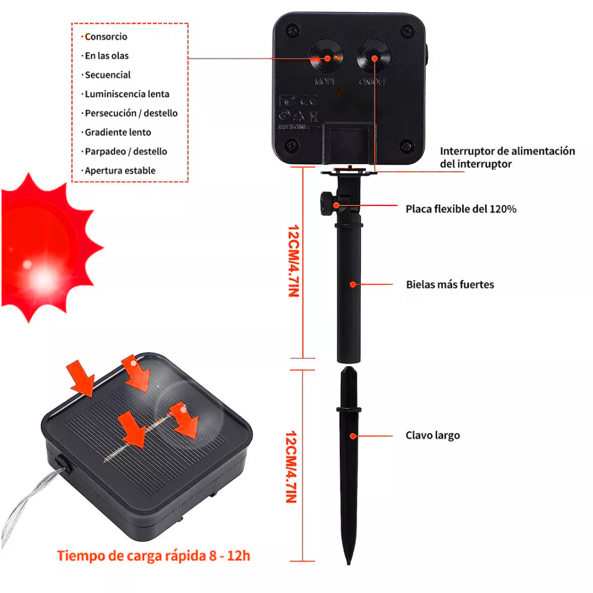 Energía Solar 100% Eficiente: Equipadas con un panel solar avanzado, estas luces se cargan automáticamente durante el día para iluminar tus noches sin necesidad de cables ni enchufes.