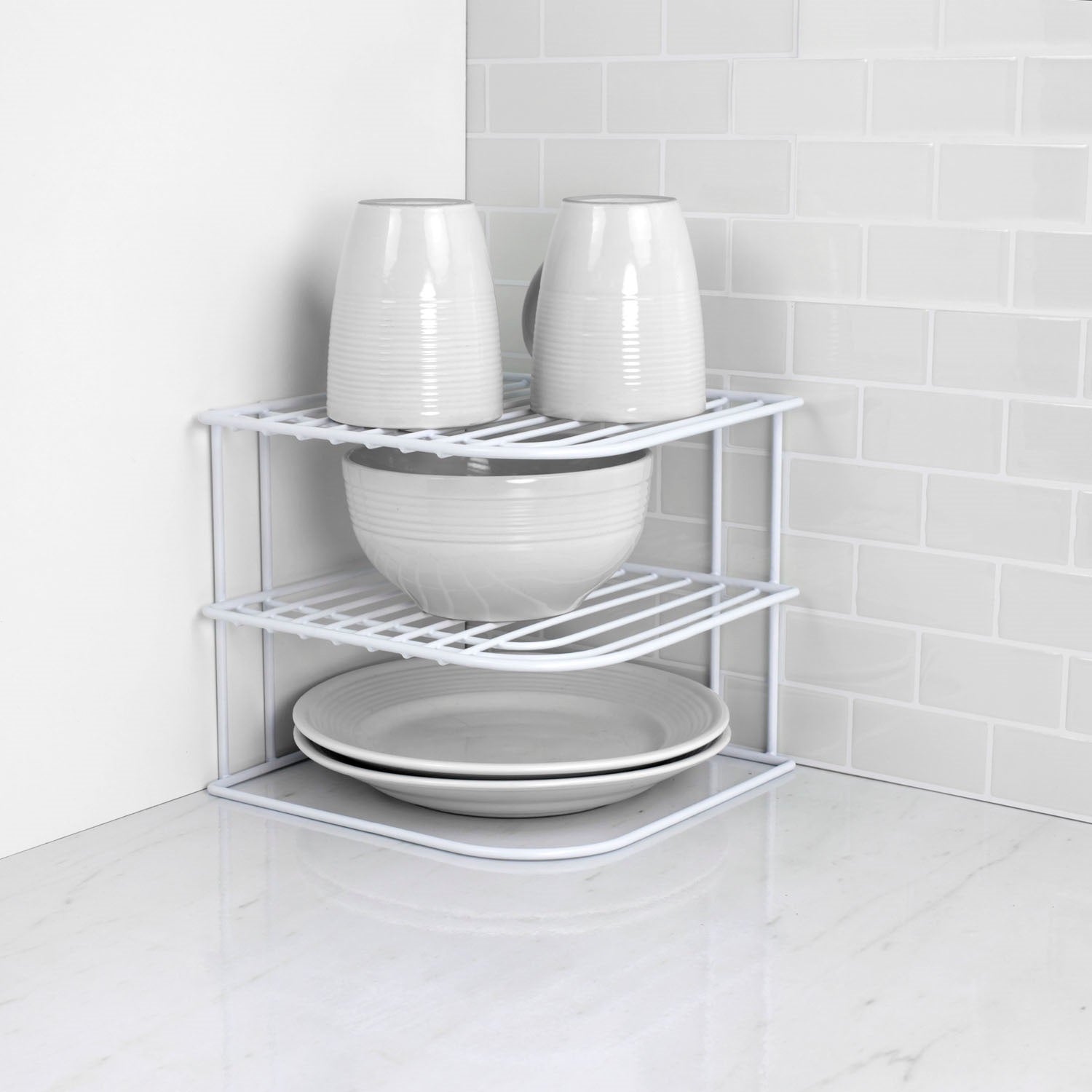 Almacene y organice platos, tazas, tazones y otros elementos esenciales de la cocina en este estante de la esquina. Hecho de un acabado de acero recubierto de vinilo. 2 niveles, perfecto para mostradores y armarios. El perfil pequeño lo mantiene apartado, pero aún conserva una buena cantidad de artÃculos de cocina. Se ve muy bien en cualquier entorno de cocina. Hecho de acero 2 estantes proporcionan un amplio espacio para almacenar vajilla Medidas: 8.87 pulg. X 8.87 pulg. X 7.87 pulg. Perfecto para la esquina de la encimera. El diseño simple se adapta a cualquier entorno de cocina