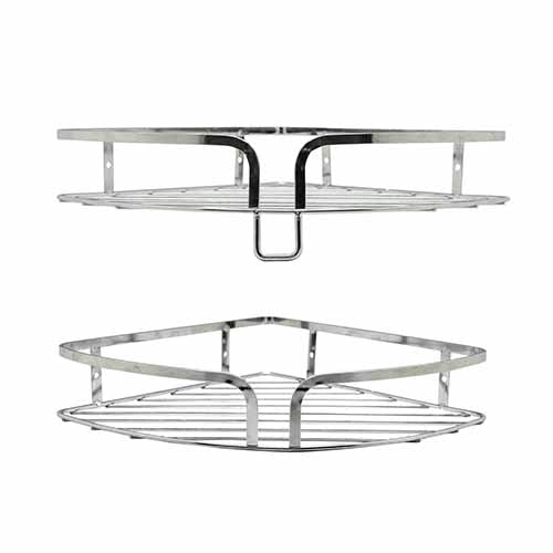 Organizador de regadera Este bastidor de almacenamiento cuenta con un diseño de cesta triangular de dos pisos que es adecuado para esquinas y ahorra espacio. El estante de almacenamiento en forma de triángulo se puede montar en la esquina de la pared, lo que aprovecha al máximo el espacio. Medidas: 9 x 34 x 28 cm. Material: Acero cromado.