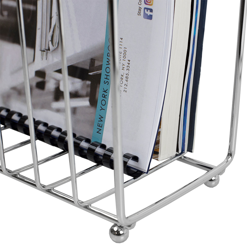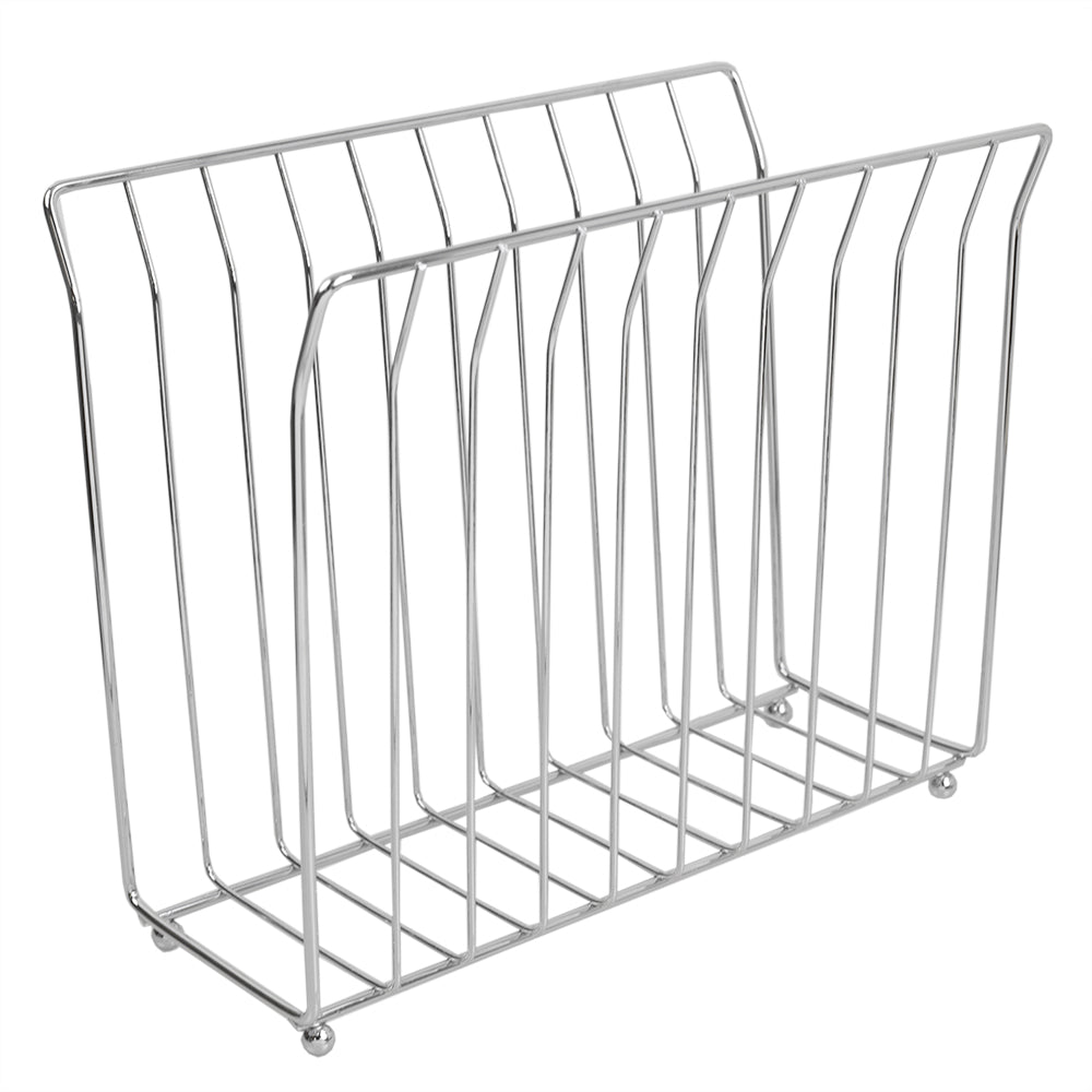 Revistero color plateado. Elaborado en alambre chapado en cromo. Organiza tus periódicos y revistas con el organizador de revistas de piso más grande del mercado, que hará que tu salón, baño o dormitorio se vea ordenado y ordenado cada momento del dÃa. Ofrece espacio para revistas y otros. Resiste a las manchas.