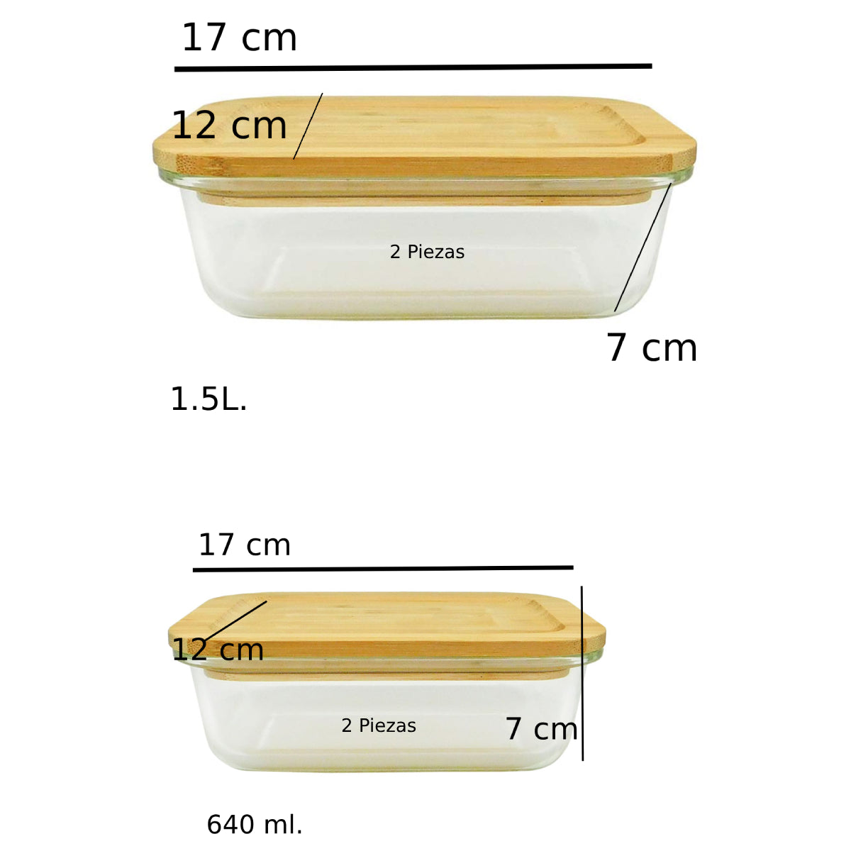Con una capacidad de 2 contenedores de 640 ml. 17 x 6 x 12 cm, y 2 contenedores más grandes, de 1,5 L. y dimensiones 22 x 7 xDimensiones perfectas, para tu lonchera, mochila y bolsa de mano, estilo y practicidad con nuestro Set de 4 Contenedores de Vidrio y Bambú, diseñado para facilitar el transporte de alimentos de a cualquier lugar, ya sea a la escuela.