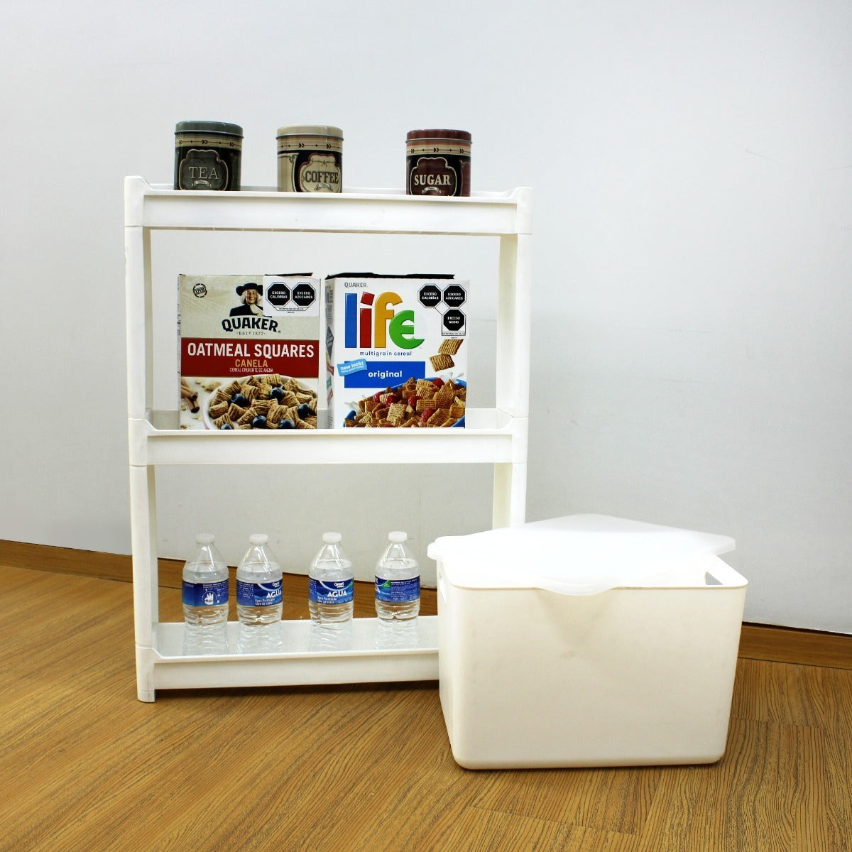 Set de carrito organizador vertical de 3 niveles multifuncional ya que lo puedes utiliar en la cocina, baño o lavanderia, en la parte de abajo cuenta con 4 rueditas para mover facilmente, ahorra espacio. Incluye una caja de plástico grande blanca con tapa y agarraderas en los laterales.Puedes encontrar más productos como este en nuestra página oficial de : https://tienda.mercadolibre.com.mx/ellegance-houseware