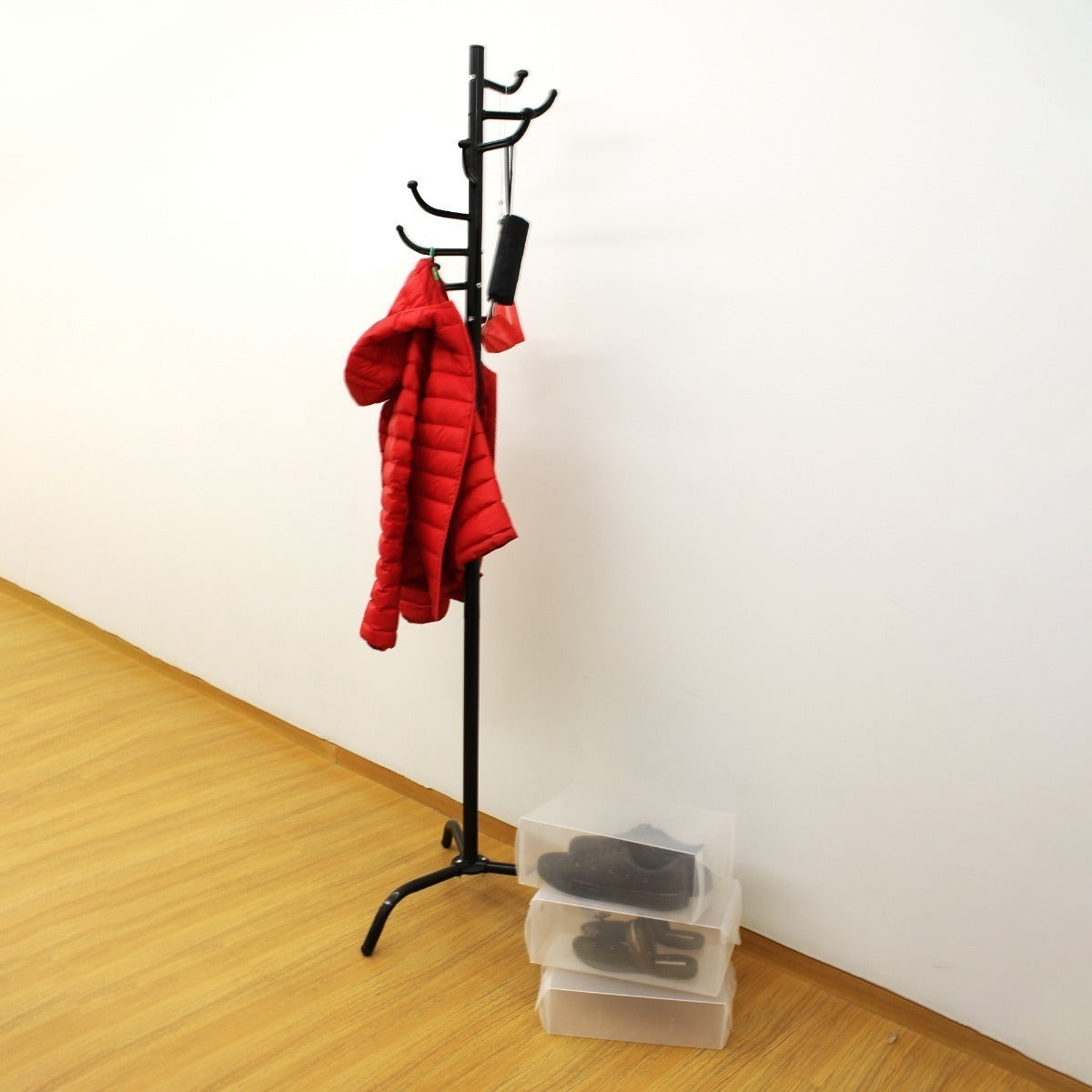 Perchero con 8 ganchos, perfecto para mantener organizados abrigos, sacos, suéteres, paraguas, gorras, bolsas, etc. Dale un toque elegante a tu hogar con este práctico perchero. Incluye 3 cajas de plástico armables para guardar zapatos que requieran de un mayor cuidado.Puedes encontrar más productos como este en nuestra página oficial de : https://tienda.mercadolibre.com.mx/ellegance-houseware