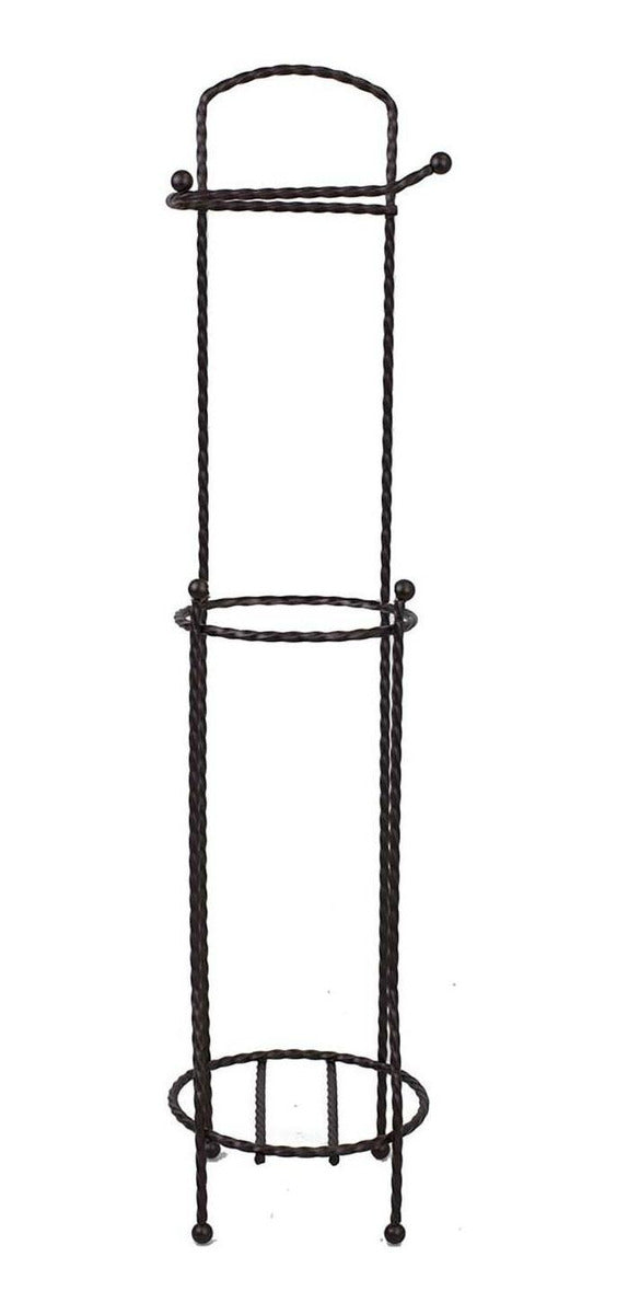 La base guarda convenientemente hasta tres rollos adicionales, por lo que puede cambiar uno cuando lo necesite. El marco de acero presenta patas elevadas que elevan ligeramente el papel higiénico para que no entre en contacto con pisos sucios. Sin necesidad de montaje o herramientas para instalar, simplemente colóquelo donde desee. La base de acero ayuda a evitar que se vuelque. 4 pies elevados ayudan a mantener el papel higiénico limpio y alejado del piso. Hecho de acero recubierto de bronce.Medidas en 6.5 pulgadas x 6.5 pulgadas x 26 pulgadas.
