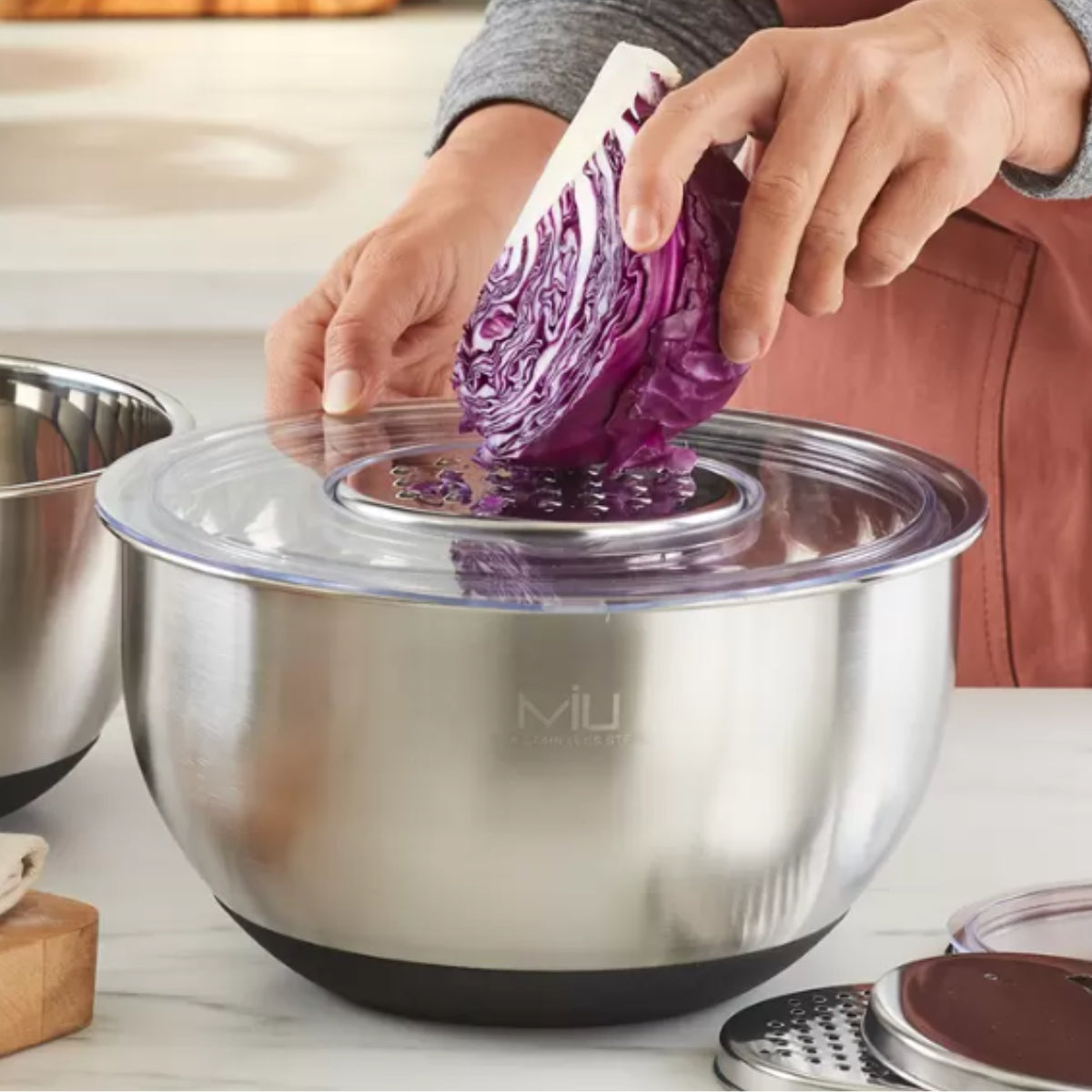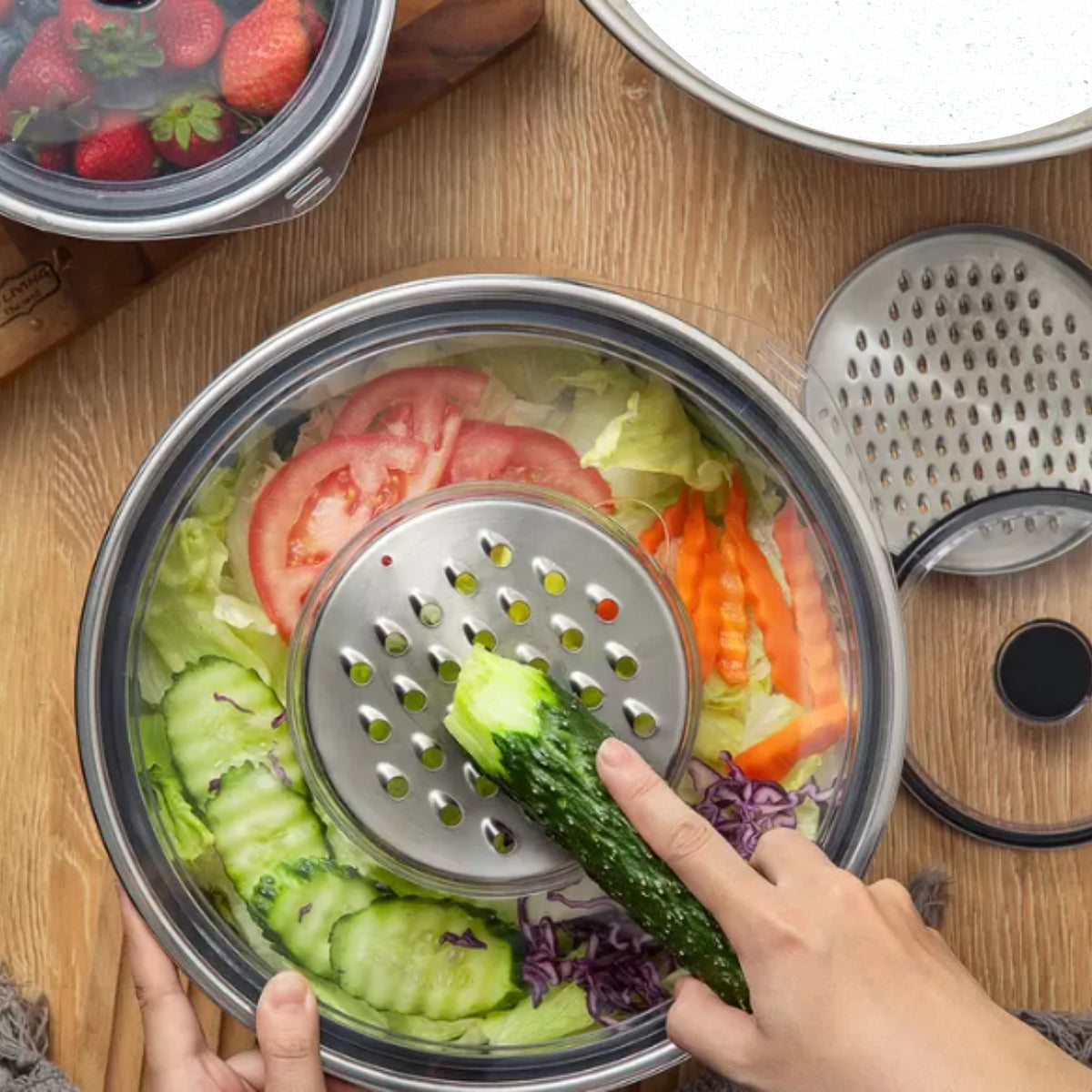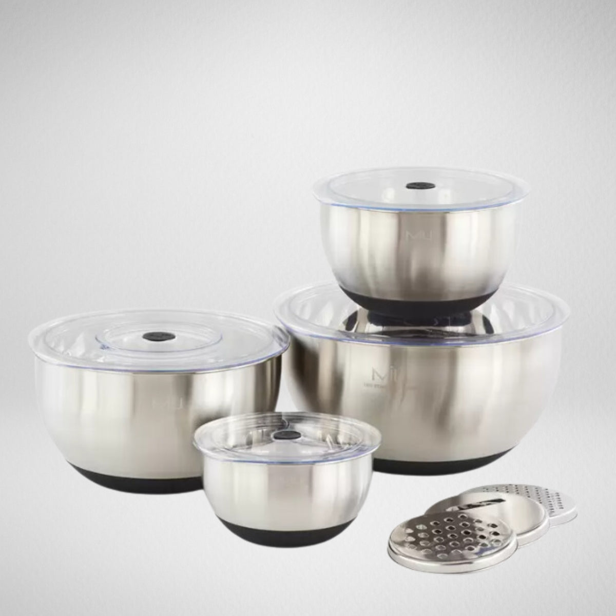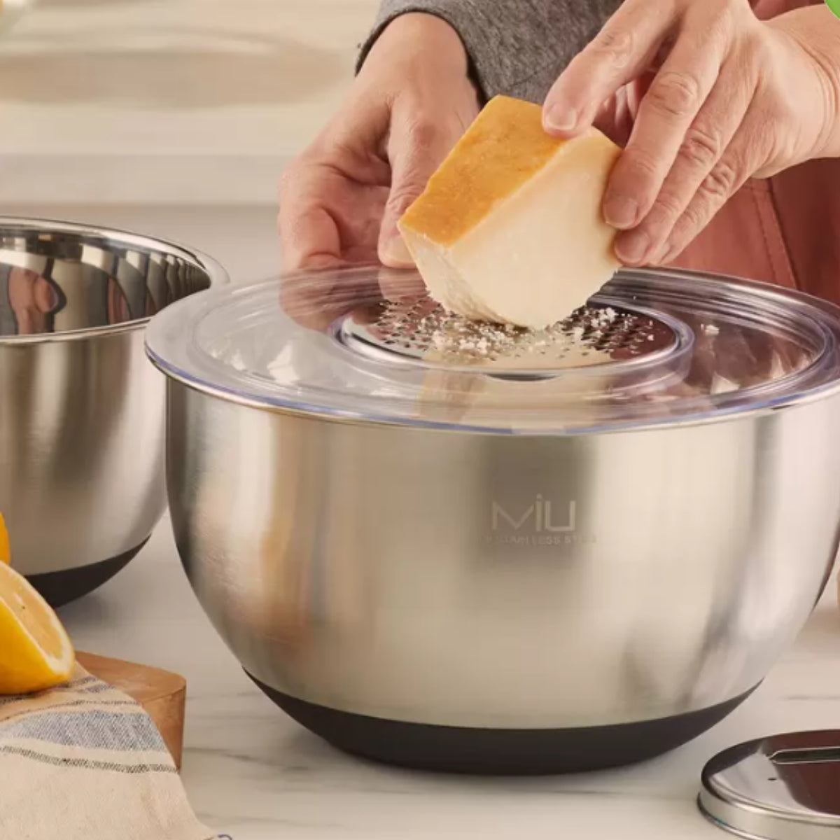 Este elegante set incluye cinco tazones de acero inoxidable de distintos tamaños, ideales para mezclar, almacenar y preparar alimentos. Cada tazón viene con una tapa transparente que asegura frescura y facilita el almacenamiento. Además, el set incluye discos intercambiables tipo rallador que se adaptan a uno de los tazones, permitiéndote rallar directamente en el recipiente para mayor comodidad.